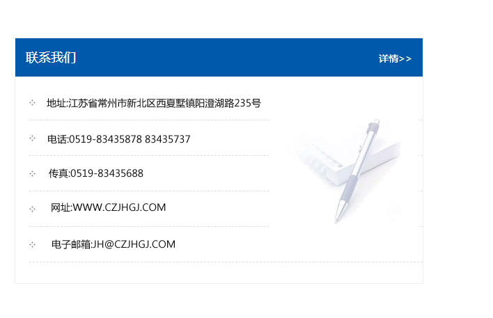 地址:常州市新北區友邦商務大廈1幢16、17層  電話:0519-85101652  傳真:0519-85112595  郵編:213022  網址:www_cz-jiayue_cn.waiyongchina.com  郵箱:xiajifengaa@163.com